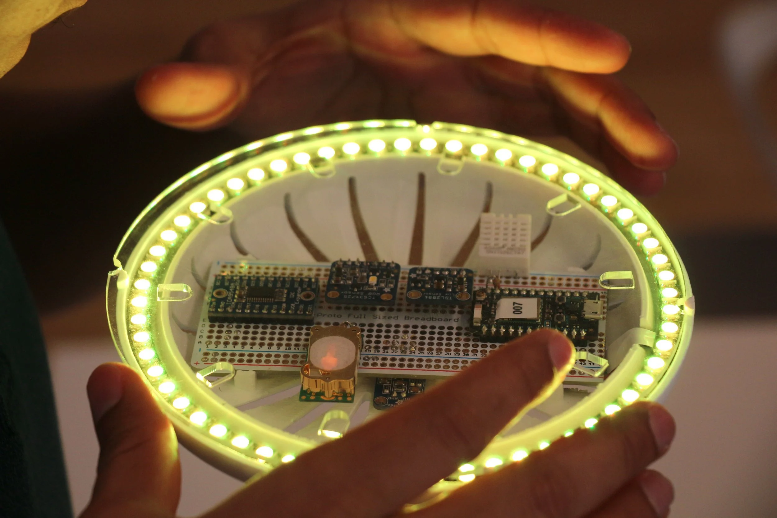 For one of our earliest IoT prototypes, an environmental sensor named HALO [heuristic ambient luminous object], we built our own circuit boards, developed software, and 3D printed the shell. HALO never materialized as a product, but its premise was intriguing: that digital information, in this case humidity, temperature, and CO2 sensor data, could be visualized in an ambient and human-centric way using colored, emotive lighting.
